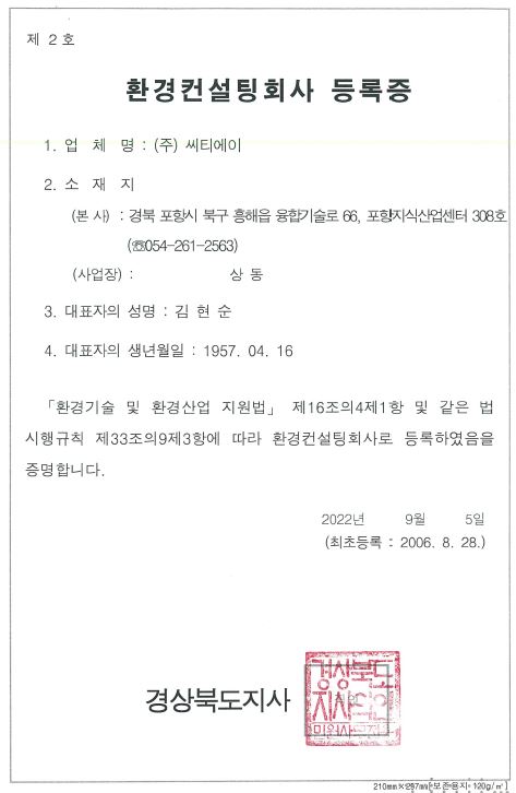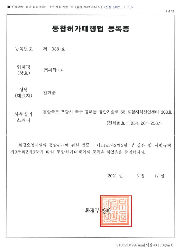 앞으로도 환경문제가 귀사의 발전에 더 이상 걸림돌이 되지 않도록 선도적 친환경기업을 향한 발걸음에 저희 (주)씨티에이가 함께하겠습니다.